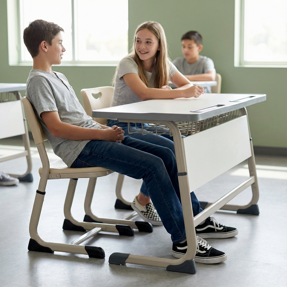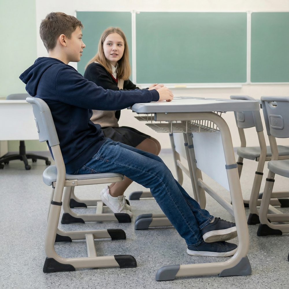Ножки парты и ученических стульев изготовлены из добротного стального профиля и покрыты порошковой эмалью методом электростатического напыления с термозакалкой — это обеспечивает качественное равномерное покрытие, устойчивость к царапинам и интенсивной ежедневной нагрузке.